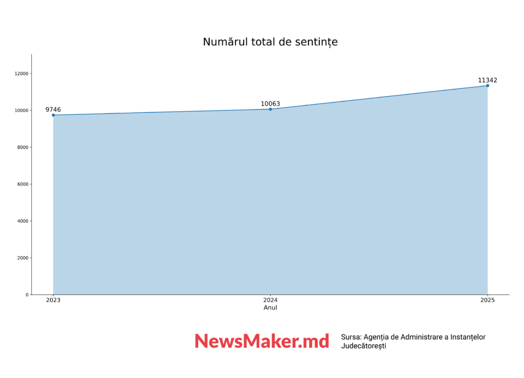 Mai multe detalii despre situația din sistemul judecătoresc al Moldovei pot fi găsite în rapoartele statistice ale Agenției de Administrare a Instanțelor Judecătorești. Potrivit acestora, în 2025, judecătorii din prima instanță au pronunțat 11,3 mii de sentințe împotriva persoanelor fizice în cauze penale. Majoritatea covârșitoare a sentințelor sunt de condamnare (puțin peste 90%). În celelalte cazuri este vorba despre sentințe de achitare sau încetarea procesului judiciar. Dacă comparăm cu anii precedenți, în 2025 numărul total al sentințelor de toate tipurile a crescut cu 12,71%, iar în 2024 – cu 16,38%.