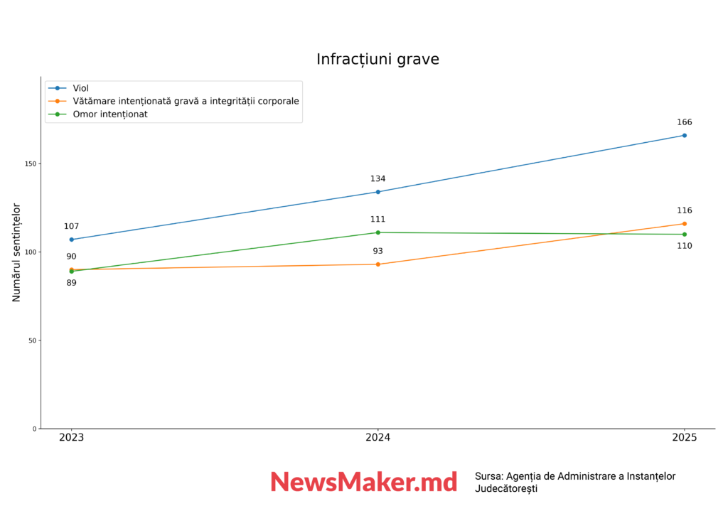 Datele BNS indică o creștere a numărului de infracțiuni grave și deosebit de grave în ultimii ani. Acestea reprezintă aproape un sfert din totalul infracțiunilor. Această tendință este confirmată și de datele privind sentințele pronunțate de instanțele de primă instanță. Dacă în 2025 numărul omorurilor intenționate a crescut nesemnificativ (cu 0,9%), atunci în 2024 acesta a crescut cu 24,72%. Numărul sentințelor pentru vătămări intenționate grave a crescut anul trecut cu 24,73%, iar pentru violuri – cu 23,88%.