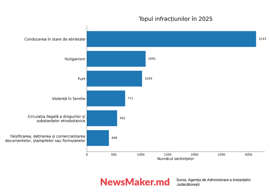 În mod tradițional, instanțele pronunță cele mai multe sentințe pentru conducerea în stare de ebrietate (3,1 mii). La mare distanță, pe locul doi, se află sentințele pentru huliganism (1 mie), iar pe locul trei – pentru furt (1 mie). Urmează sentințele pentru violență în familie (711), pentru circulația ilegală a drogurilor și a substanțelor etnobotanice (562), precum și pentru falsificarea, deținerea sau comercializarea documentelor, ștampilelor sau formularelor false (409).