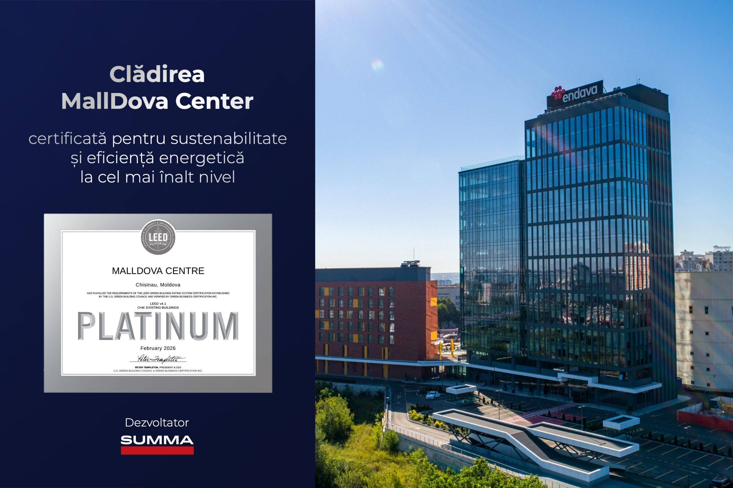 Cea mai recentă confirmare este obținerea certificării LEED v4.1 O+M Platinum, cel mai înalt standard internațional acordat clădirilor pentru performanță operațională, eficiență și sustenabilitate, pentru cinci clădiri emblematice din Chișinău, cu o suprafață totală de aproximativ 90.000 mp. Este vorba despre Shopping MallDova, MallDova Center (Endava Tower), Medpark International Hospital, Courtyard by Marriott Chisinau și Radisson Blu Leogrand Hotel Chisinau.