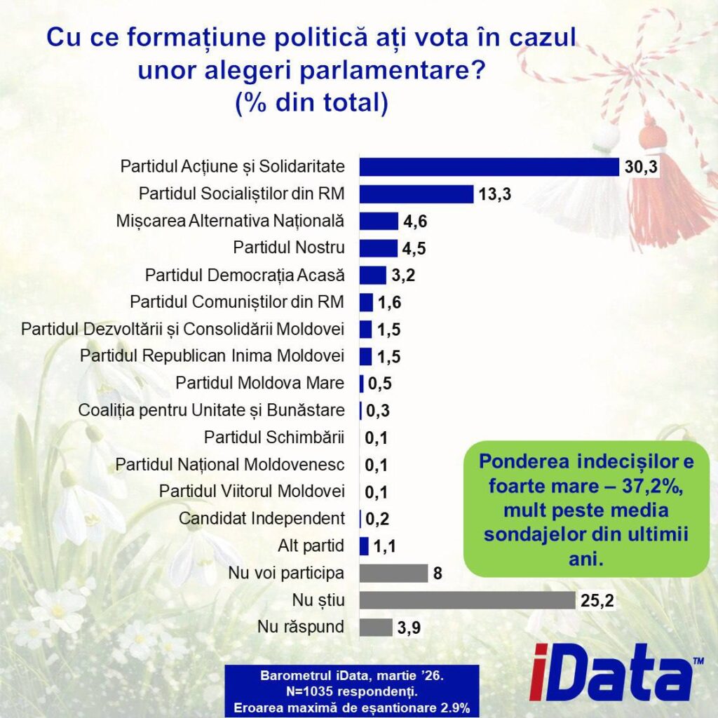Доля тех, кто не знает за кого голосовать, не планирует идти на избирательные участки или вовсе отказался отвечать, достигла 37,2%. Этот показатель, превышающий треть от общего числа избирателей, существенно выше прошлогодних опросов. Среди всех респондентов, включая эту обширную группу неопределившихся, лидирующие позиции удерживает правящая партия «Действие и солидарность» (PAS) с поддержкой 30,3%, за которой следует Партия социалистов (ПСРМ) с 13,3%.