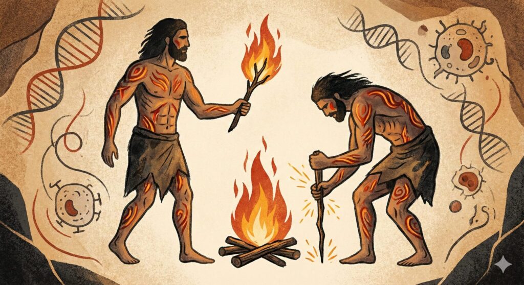 Ученые проанализировали геном человека и сравнили его с геномами приматов. Оказалось, что гены, отвечающие за заживление ран и воспалительные реакции, у людей эволюционировали значительно быстрее. Постоянное соседство с открытым огнем действовало как жесткий фильтр естественного отбора: выживали те, чья иммунная система могла быстро справиться с ожогом и не допустить смертельной инфекции. Это объясняет, почему реакция человеческого организма на травмы иногда бывает чрезмерно бурной — это древний защитный механизм.